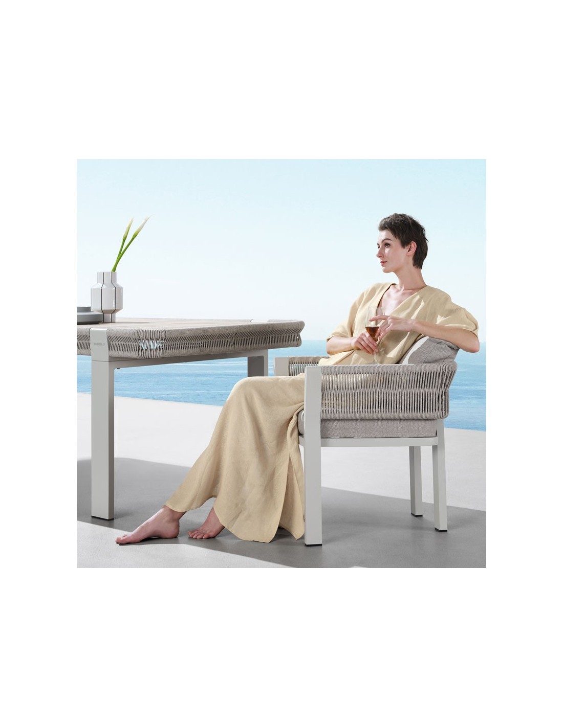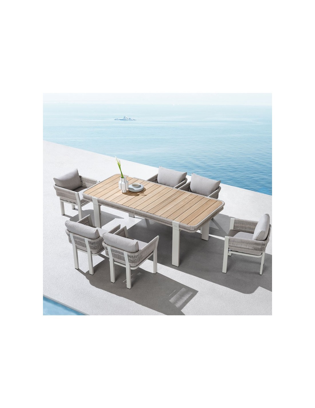 Το Borromeo Taupe της Oranon είναι η επιτομή της διακριτικής πολυτέλειας και της σύγχρονης αρμονίας. Δημιουργημένο για να αναβαθμίσει κάθε εξωτερικό χώρο, το σετ συνδυάζει αψεγάδιαστη αισθητική με υψηλή ποιότητα κατασκευής, αποπνέοντας ηρεμία, ισορροπία και κομψότητα. Ο σκελετός από ανθεκτικό αλουμίνιο σε κομψή απόχρωση taupe δημιουργεί μια ζεστή και φιλόξενη βάση, ενώ οι επιφάνειες από φυσικό ξύλο teak προσθέτουν αυθεντικότητα και φυσικότητα. Οι λεπτομέρειες από υφαντό σχοινί ολοκληρώνουν τη σύνθεση, προσφέροντας υφή και βάθος σε μια κατασκευή που ξεχωρίζει για τη φινέτσα και τη σταθερότητά της. Σχεδιασμένο για να αντέχει στις καιρικές συνθήκες χωρίς να χάνει την αισθητική του αξία, το Borromeo Taupe μετατρέπει κάθε γεύμα σε μια εμπειρία χαλάρωσης και στυλ. Είναι η ιδανική επιλογή για όσους επιθυμούν να απολαμβάνουν στιγμές άνεσης και φιλοξενίας σε έναν χώρο που αποπνέει πολυτέλεια με φυσικό χαρακτήρα. Με το Borromeo Taupe, η Oranon υπογράφει ένα σετ τραπεζαρίας που συνδυάζει αισθητική αρτιότητα, λειτουργικότητα και διαχρονική κομψότητα — ένα πραγματικό στολίδι για τον εξωτερικό σας χώρο